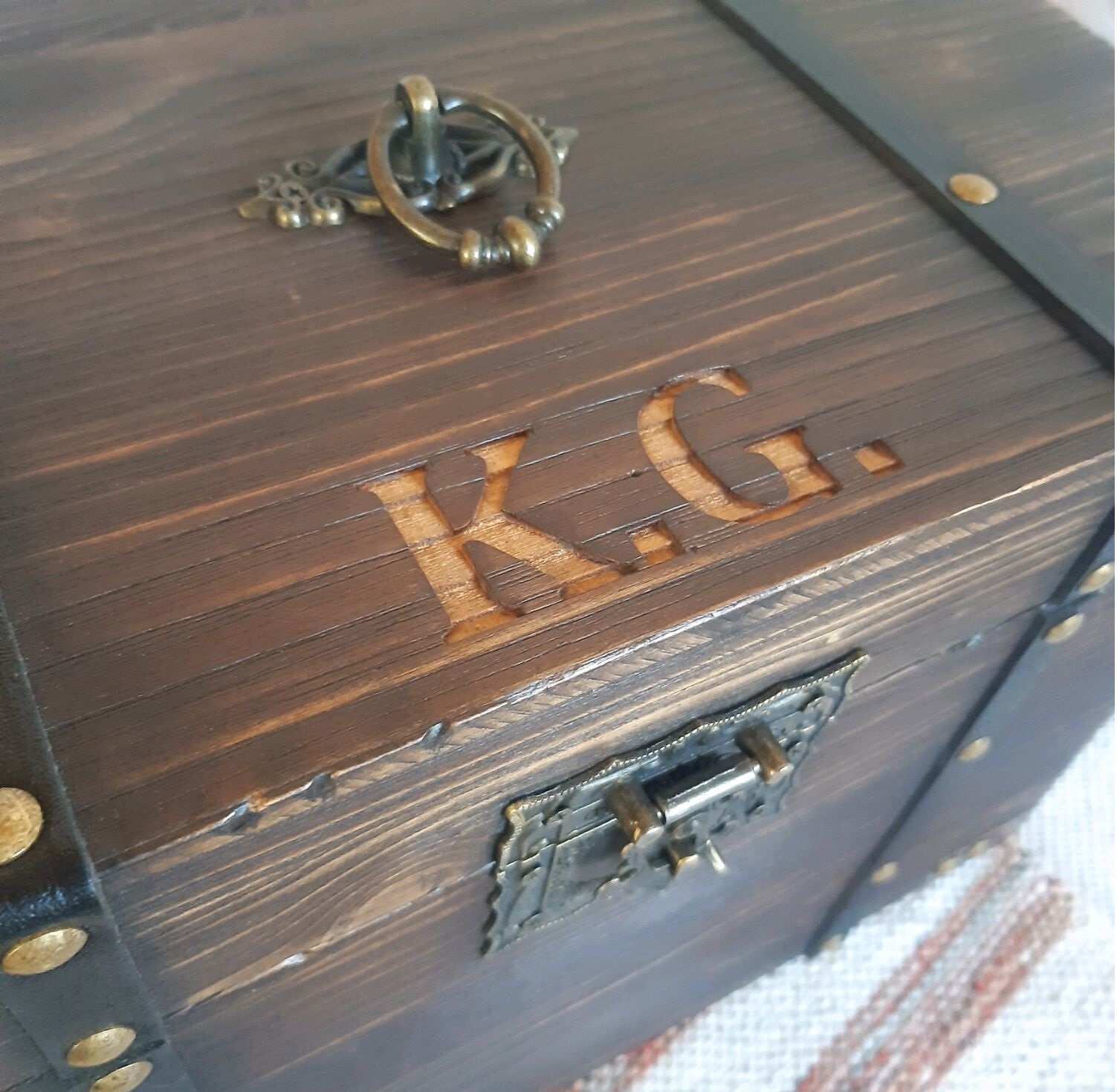 Сундук под старину для подарка с именной гравировкой. Отличительная особенность его- внутри и снаружи он одного цвета. Другая особенность - личный девиз на внутренней стороне крышки, выполненный гравировкой. Сундук протонирован морилкой и покрыт восками. Для отделки использована натуральная кожа и металлическая фурнитура цвета античной бронзы. Запирается сундук на навесной замочек с ключиком. Такой сундук можно подарить молодым в качестве свадебного подарка, на годовщину свадьбы или на день рождения. * Гравировка от 1200 рублей, в зависимости от размера и сложности. **Замочек не входит в стоимость сундучка, приобретается отдельно. Вы можете выбрать в моем магазине тот, который больше понравится.